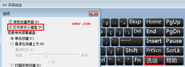 2、默认屏幕键盘没有“小键盘”,可以点击“选项”